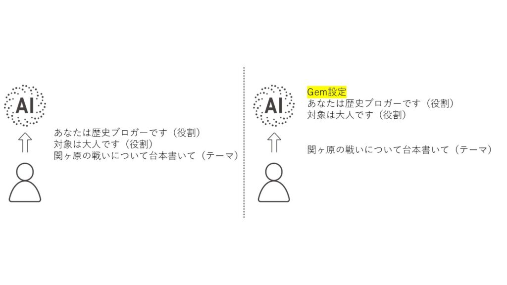 - 特定の役割を与える:「あなたは歴史ブログの台本を作るブロガーです」「あなたはわかりやすく説明する先生です」といった役割を設定できる